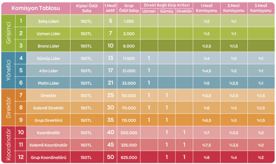 Komisyon: SL olarak ekibinin net satışından kazanacağın tutarı ifade eder. Komisyona kaynak oluşturan ekibin satışları ödendikçe oluşan komisyon, SL'nin hesabına yatırılır. En az MST kadar ödül satışı olan Temsilcilerin satışı, SL komisyon hesabına sayılır.